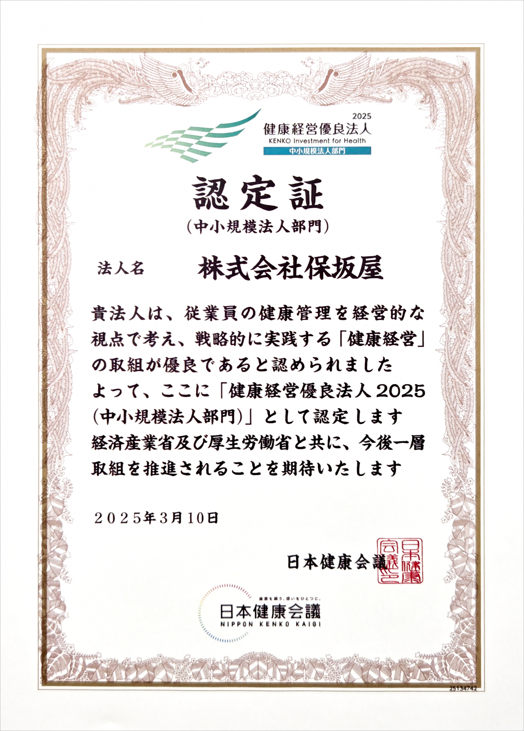 健康経営優良法人2025に認定